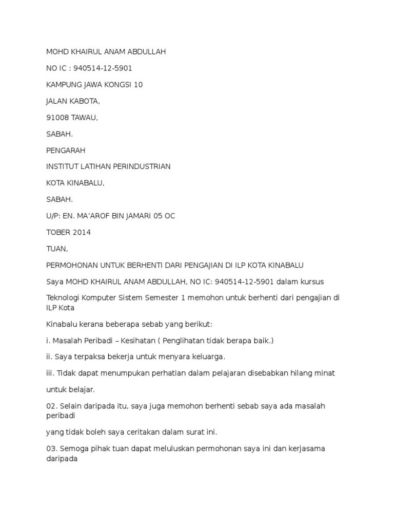 Contoh format surat rasmi berhenti. Merujuk perkara diatas, saya (nama & no id pelajar) yang pada masa ini sedang mengikuti program. Contoh surat rasmi, contoh surat rasmi aduan, contoh surat rasmi sakit, contoh surat rasmi . Saya mohd khairul anam abdullah, no ic: Contoh surat pengunduran diri kerja png 1131 1600 surat pengunduran diri surat belajar . Surat rasmi berhenti sekolah contoh rasmi b.